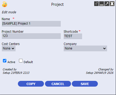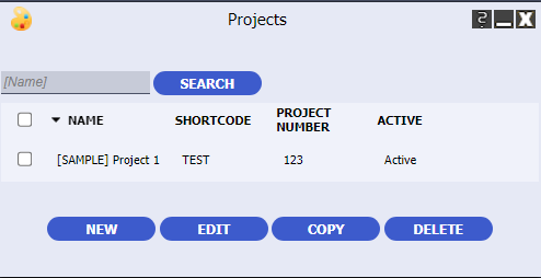 You can find the project through entering it's name in the SEARCH field and clicking the respective button. To add a project, click the NEW button. To edit an existing project, click the EDIT button. Clicking the DELTE button deletes an existing project. Clicking the COPY button duplicates an existing project and it is then editable to the current parameters you want.