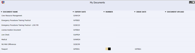 My Documents is a function in N-OC Mobile and Web for crewmembers to monitor their document expiry. In this article, we present the N-OC web related functionality. The window is accessible from the option Human resources / My Documents. This opens a window, which lists: