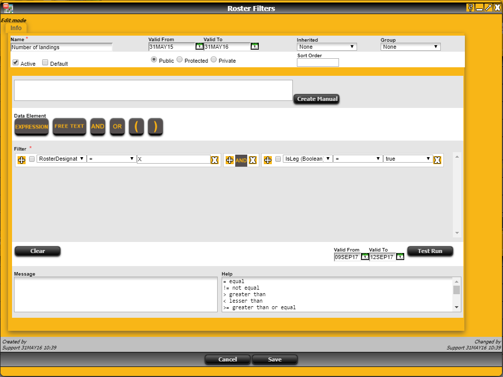 To edit a Roster Filter, click the EDIT button. If more than one Roster Filters is needed to be edited, select the appropriate checkboxes. After clicking the EDIT button, each item will appear in a separate window and can be edited in turn. Once the required amendments have been made, select the SAVE button to commit the changes to the database. To discard changes, click the CANCEL button.