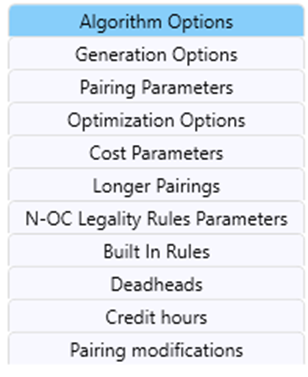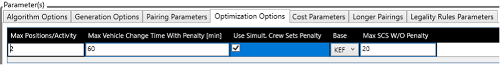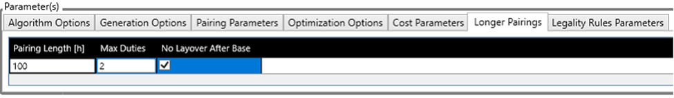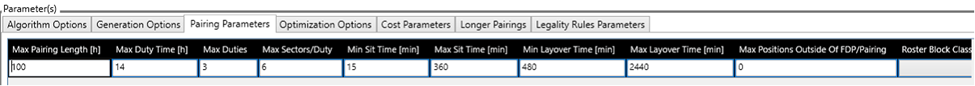 | Max Duties | Defines Maximum number of duties allowed in the pairing. This parameter currently works together with the "Paring Parameter - Max pairing length". E.g. if Max Duties is 2 and "Paring Parameter - Max pairing length" is 48, then you will get a 2 days parting. |