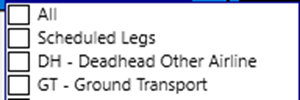 | Filter | Filter the flights from the loaded schedule to used by the tool. This is a Leg Filter. Note: You will get a better generation if you apply a filter. |
