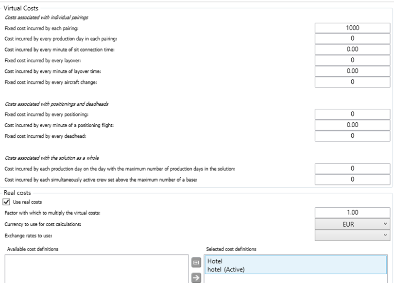 With the introduction of version 21.6, it is possible to use Virtual and Real Cost in the optimization. fixed cost accrued by each pairing. We recommend 1000 or higher.