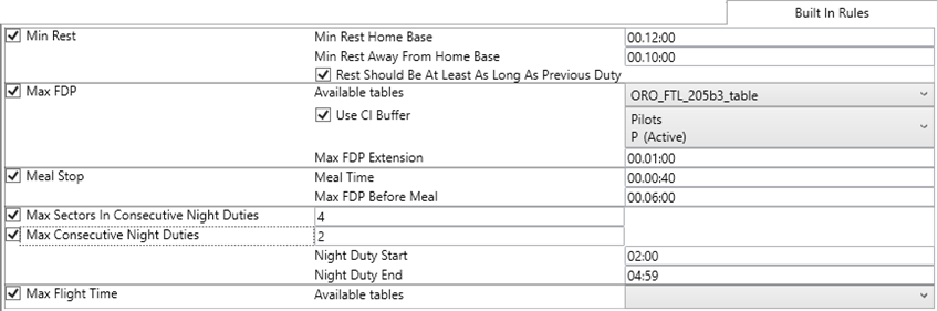| Max Flight Time | Setting up Max Flight Time with the appropriate table, the Optimizer should be able to mimic the rule regarding max flight time in FAR117. |