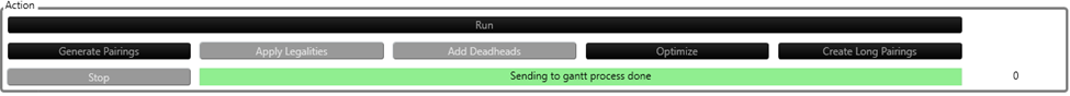 When this button is clicked, the pairing generation takes place, then legalities are applied on the generated pairings. If Add Deadheads On Run checkbox under ‘Algorithm Options’ is checked, the deadheads will be added to create pairings with the uncovered legs. Otherwise, it will jump to the optimization phase. If Round Trip Pairings is selected as a generation option and Create Longer Pairings On Run is checked (both can be found in the ‘Algorithm Options’ tab), the longer pairings out of the round trip pairings will be created.