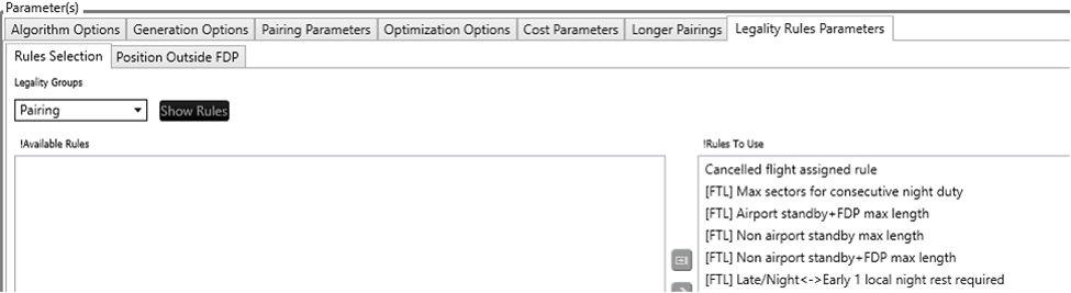 If FDP Rules are used (if ‘Max Positions Outside Of FDP/Pairing’ from ‘Pairing Parameters’ is greater than zero) then the rule(s), which constraints maximum FDP should be moved from ‘Selected Rules’ to ‘Rules To Use’.