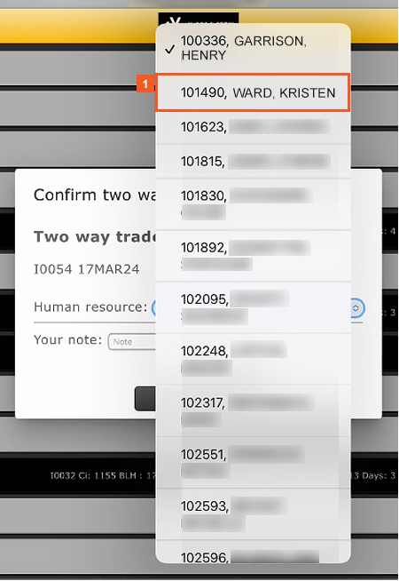You can scroll through the list and look for the person you want to trade with. You can also jump straight to the employee by typing in their employee number.